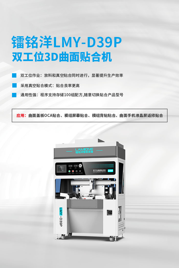 公司主營業務聚焦于生產制造柔性OLED顯示面板的貼合設備、曲面后蓋PET膜片貼合設備以及各種異形3D曲面產品的貼合設備定制開發,擁有4000多平米的現代化生產車間,為高效生產提供了堅實保障。研發團隊超20人,實力雄厚,不斷推動技術創新。同時,配備有先進的 CNC加工中心和治具開發中心,能夠快速為客戶打樣,及時響應客戶需求。